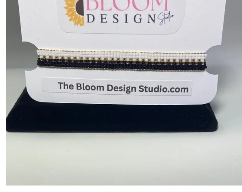Lightweight and comfortable, it includes an adjustable lobster clasp for a perfect fit. Ideal as a colorful addition or a thoughtful gift. Elegant black white and gold bracelet by The Bloom Design Studio.