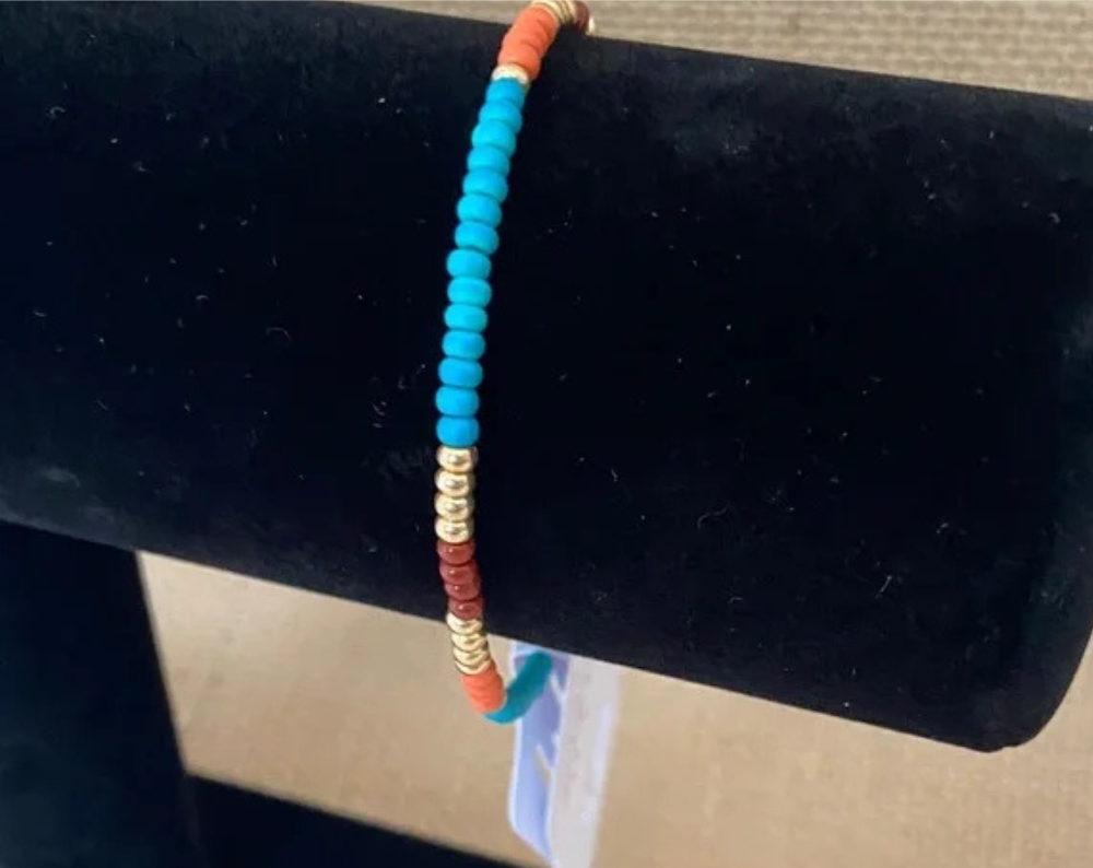 Chic bracelet with vibrant beads. Features a mix of blue, orange, and gold tones. Ideal for any style.