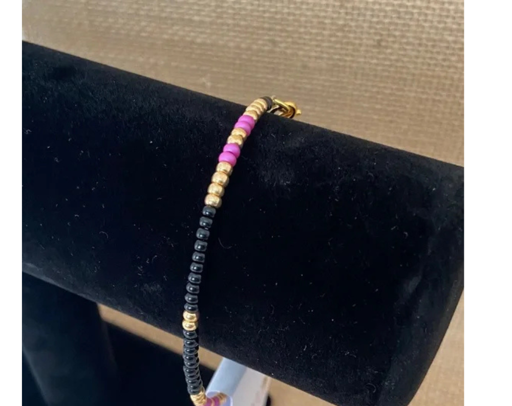 This elegant bracelet features a stunning combination of black and gold beads, accented with a touch of pink. Perfect for adding a sophisticated touch to any outfit.