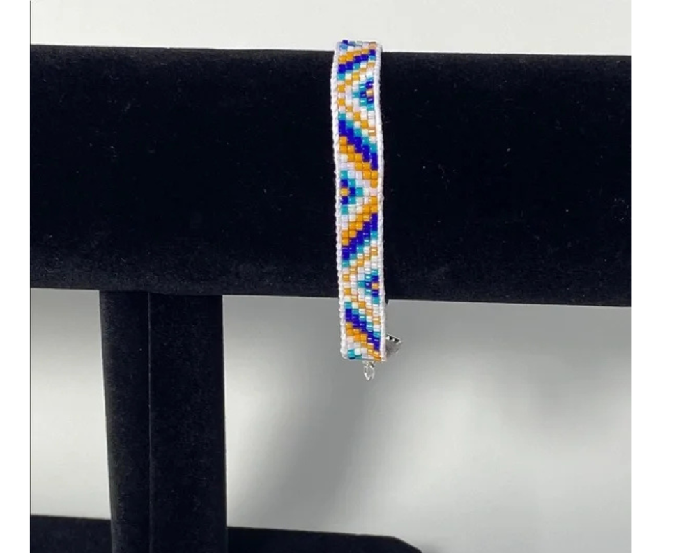 Add a unique touch to your accessory collection with this handcrafted loom-beaded bracelet.