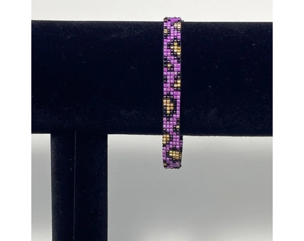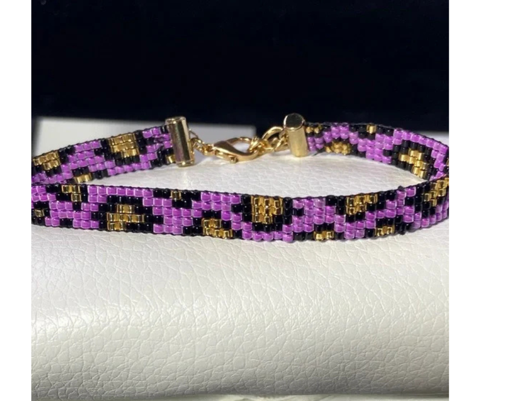 Traditional Native American Indian style beading ,weaving ,woven boho bohemian. Purple . Chic bracelet featuring intricate gold purple and black beadwork. Stylish and versatile accessory. Great gift idea for her for Mother's Day ,Birthday or Christmas.