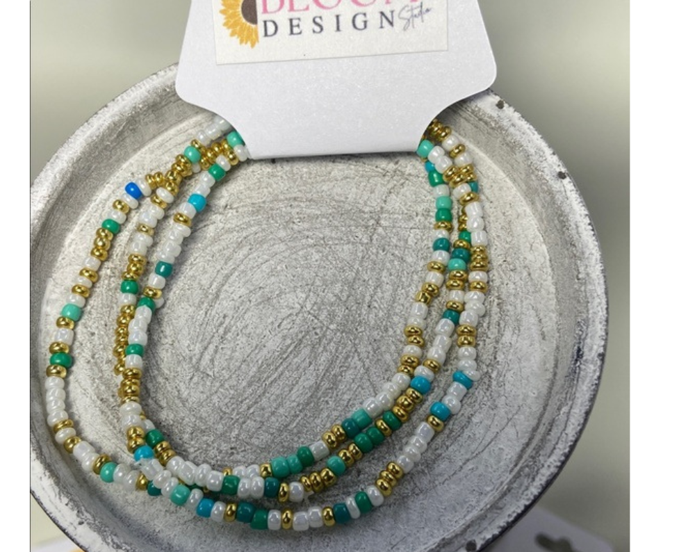 White Gold and Turquoise Green Beaded Bracelet Set of 3 Summer Beach Fun Bracelets